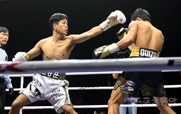 필리핀 복싱 영웅 매니 파퀴아오와 다양한 무술을 구사하는 인플루언서 DK YOO(유대경)의 스페셜 매치가 11일 경기도 고양 일산킨텍스에서 열렸다. 신종훈과 라넬리오 퀴조가 스페셜 코메인 경기를 펼치고 있다.
