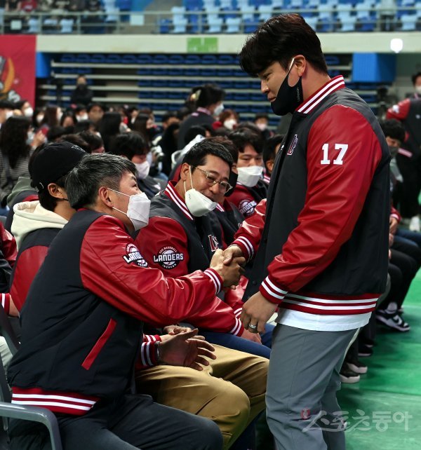 11일 인천 남동체육관에서 SSG 우승기념 ‘2022 CHAMPIONS FAN FESTIVAL’ 행사가 열렸다. SSG 김원형 감독이 추신수와 인사를 나누고 있다.