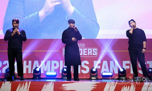 11일 인천 남동체육관에서 SSG 우승기념 ‘2022 CHAMPIONS FAN FESTIVAL’ 행사가 열렸다. SSG 워너비 팀(신인선수 김건웅, 안현서, 이로운)이 공연을 펼치고 있다.
