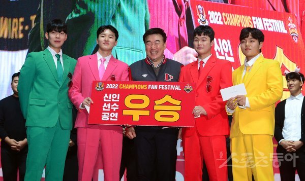 11일 인천 남동체육관에서 SSG 우승기념 ‘2022 CHAMPIONS FAN FESTIVAL’ 행사가 열렸다. 문학동 날라리 팀(신인선수 김건이, 김민준, 조강희, 김정민)이 우승을 차지한 후 류선규 단장과 기념촬영을 하고 있다.