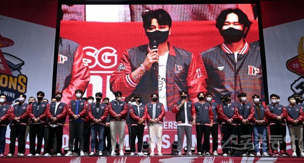 11일 인천 남동체육관에서 SSG 우승기념 ‘2022 CHAMPIONS FAN FESTIVAL’ 행사가 열렸다. SSG 추신수가 선수대표로 2023시즌 각오를 밝히고 있다.