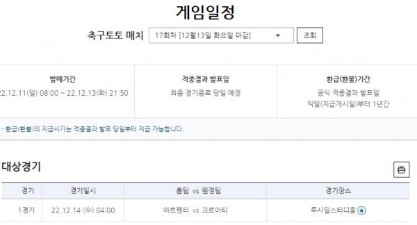 국민체육진흥공단에서 발행하는 체육진흥투표권 스포츠토토의 수탁사업자 스포츠토토코리아가 오는 14일(수) 오전 4시 루사일스타디움에서 열리는 2022카타르월드컵 4강전 아르헨티나(홈)-크로아티아(원정)전을 대상으로 축구토토 매치 17회차 게임을 발매한다.전반 및 최종 스코어 맞히기…13일(화) 오후 9시50분 발매 마감