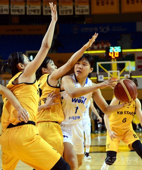 18일 충청북도 청주체육관에서 열린 ‘신한은행 SOL 2022-2022 여자프로농구’ 청주 KB와 아산 우리은행의 경기에서 우리은행 박지현이 KB 수비를 피해 슛을 쏘고 있다.