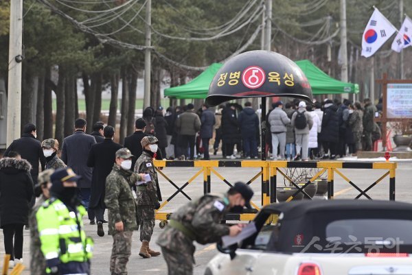 방탄소년단 진이 13일 경기 연천 5보병사단 신병교육대대에 군입대를 했다. 사설 경호원들이 방탄소년단 진의 입대에 앞서 부대에 출입하고 있다.