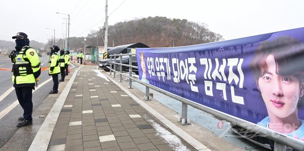 방탄소년단 진이 13일 경기 연천 5보병사단 신병교육대대에 군입대를 했다. 위병소 앞 도로에 방탄소년단 진을 응원하는 현수막이 설치돼 있다.