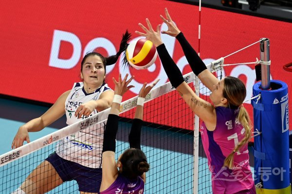 13일 인천 삼산월드체육관에서 ‘2022-2023 도드람 V리그’ 인천 흥국생명과 김천 한국도로공사의 여자부 경기가 열렸다. 한국도로공사 카타리나가 흥국생명 블로커를 피해 공격을 펼치고 있다.