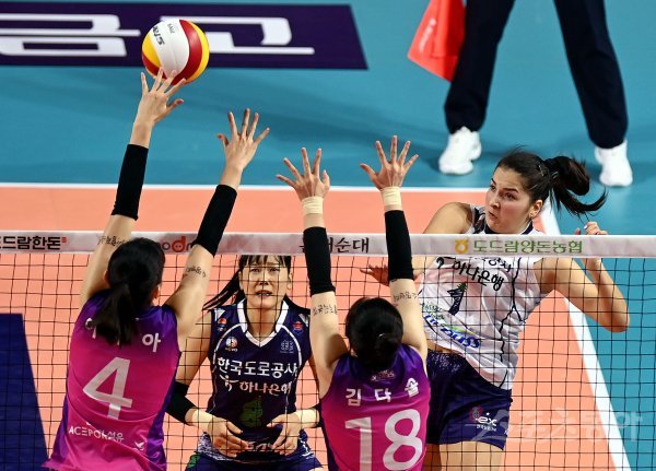 13일 인천 삼산월드체육관에서 ‘2022-2023 도드람 V리그’ 인천 흥국생명과 김천 한국도로공사의 여자부 경기가 열렸다. 한국도로공사 카타리나가 흥국생명 블로커를 피해 스파이크를 날리고 있다.