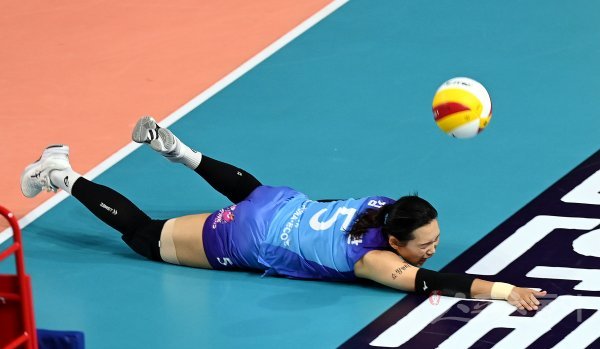 13일 인천 삼산월드체육관에서 ‘2022-2023 도드람 V리그’ 인천 흥국생명과 김천 한국도로공사의 여자부 경기가 열렸다. 흥국생명 김해란이 수비를 펼치고 있다.