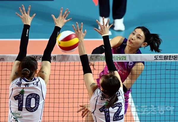 13일 인천 삼산월드체육관에서 ‘2022-2023 도드람 V리그’ 인천 흥국생명과 김천 한국도로공사의 여자부 경기가 열렸다. 흥국생명 김연경이 한국도로공사 블로커를 피해 스파이크를 날리고 있다.