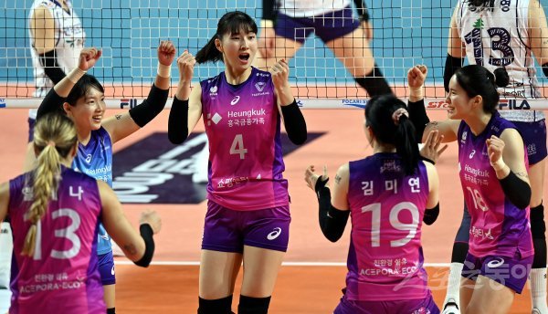 13일 인천 삼산월드체육관에서 ‘2022-2023 도드람 V리그’ 인천 흥국생명과 김천 한국도로공사의 여자부 경기가 열렸다. 흥국생명 이주아가 득점을 올린 후 동료와 기쁨을 나누고 있다.