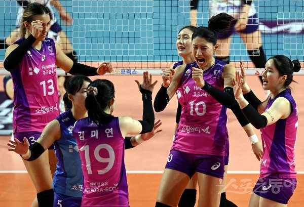13일 인천 삼산월드체육관에서 ‘2022-2023 도드람 V리그’ 인천 흥국생명과 김천 한국도로공사의 여자부 경기가 열렸다. 흥국생명 김연경이 득점을 올린 후 동료들과 기쁨을 나누고 있다.