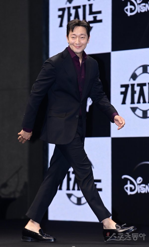 배우 손석구가 14일 서울 종로구 JW메리어트동대문스퀘어서울에서 열린 디즈니플러스 ‘카지노’ 제작발표회 무대에 오르고 있다.