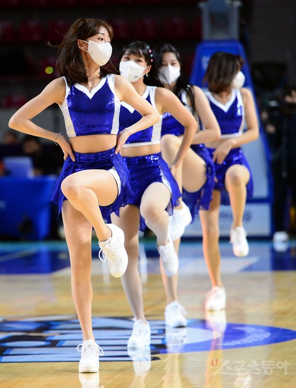 14일 경기도 용인실내체육관에서 열린 ‘신한은행 SOL 2022-2022 여자프로농구’ 용인 삼성생명과 부산 BNK의 경기에서 삼성생명 치어리더가 화려한 공연을 펼치고 있다.