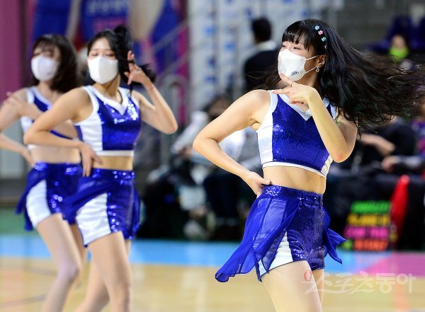 14일 경기도 용인실내체육관에서 열린 ‘신한은행 SOL 2022-2022 여자프로농구’ 용인 삼성생명과 부산 BNK의 경기에서 삼성생명 치어리더가 화려한 공연을 펼치고 있다.