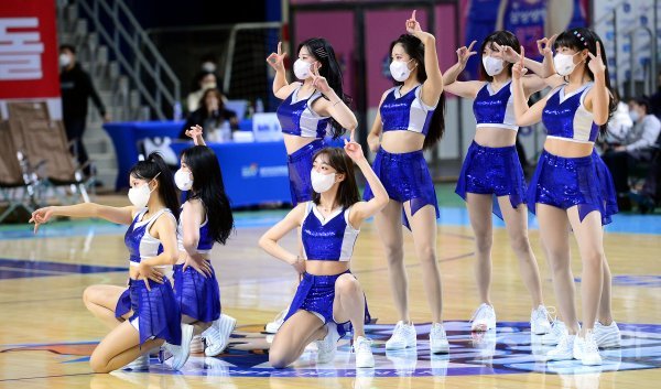 14일 경기도 용인실내체육관에서 열린 ‘신한은행 SOL 2022-2022 여자프로농구’ 용인 삼성생명과 부산 BNK의 경기에서 삼성생명 치어리더가 화려한 공연을 펼치고 있다.