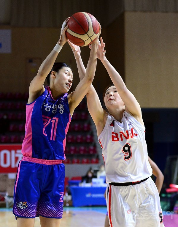 14일 경기도 용인실내체육관에서 열린 ‘신한은행 SOL 2022-2022 여자프로농구’ 용인 삼성생명과 부산 BNK의 경기에서 삼성생명 이해란과 BNK 김시온이 리바운드를 다투고 있다.