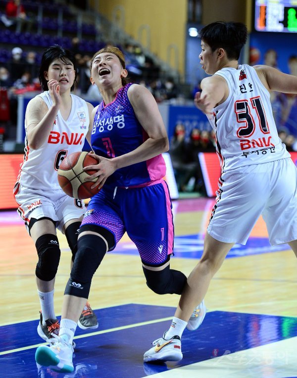 14일 경기도 용인실내체육관에서 열린 ‘신한은행 SOL 2022-2022 여자프로농구’ 용인 삼성생명과 부산 BNK의 경기에서 삼성생명 이주연이 BNK 진안의 반칙을 얻어내며 돌파하고 있다.
