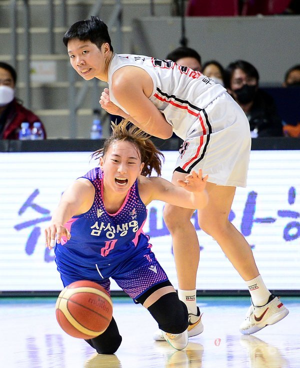 14일 경기도 용인실내체육관에서 열린 ‘신한은행 SOL 2022-2022 여자프로농구’ 용인 삼성생명과 부산 BNK의 경기에서 삼성생명 이주연이 돌파할 때 BNK 진안이 반칙을 범하고 있다.