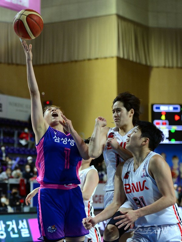 14일 경기도 용인실내체육관에서 열린 ‘신한은행 SOL 2022-2022 여자프로농구’ 용인 삼성생명과 부산 BNK의 경기에서 삼성생명 이주연이 BNK 수비를 피해 슛을 쏘고 있다.