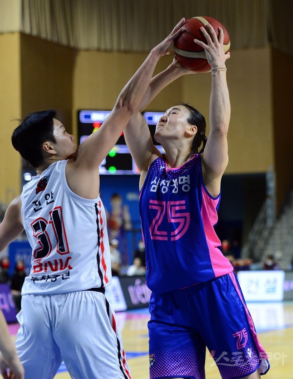 14일 경기도 용인실내체육관에서 열린 ‘신한은행 SOL 2022-2022 여자프로농구’ 용인 삼성생명과 부산 BNK의 경기에서 삼성생명 배혜윤이 BNK 진안의 수비를 앞에 두고 슛을 쏘고 있다.
