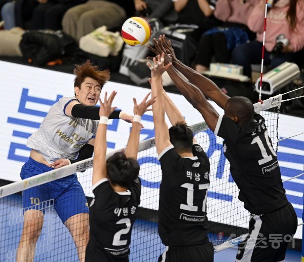14일 천안유관순체육관에서 열린 ‘2022~2023 도드람 V-리그’ 남자부 현대캐피탈과 우리카드 경기에서 우리카드 나경복이 현대캐피탈의 블로킹 사이로 스파이크를 날리고 있다.