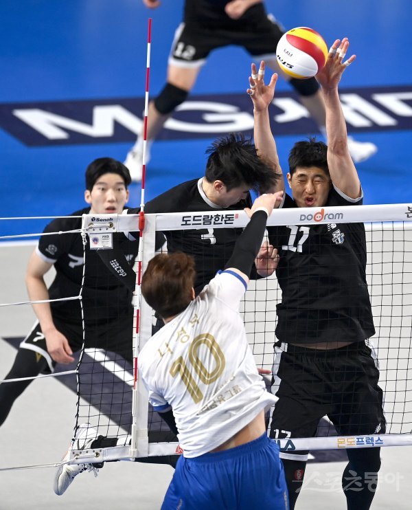 14일 천안유관순체육관에서 열린 ‘2022~2023 도드람 V-리그’ 남자부 현대캐피탈과 우리카드 경기에서 현대캐피탈 김명관과 박상하가 블로킹을 시도하고 있다.