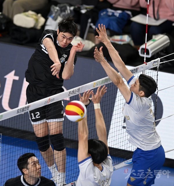 14일 천안유관순체육관에서 열린 ‘2022~2023 도드람 V-리그’ 남자부 현대캐피탈과 우리카드 경기에서 현대캐피탈 전광인이 우리카드 블로킹 사이로 스파이크를 날리고 있다.