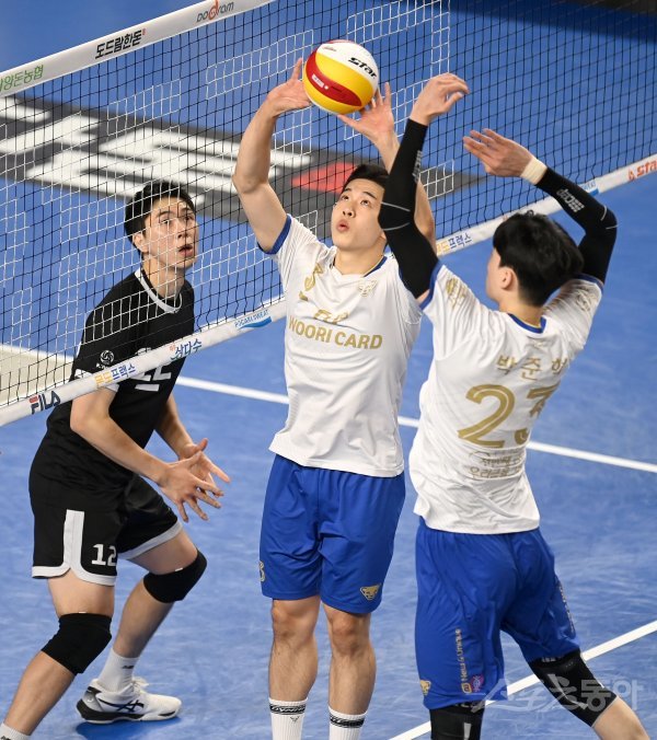 14일 천안유관순체육관에서 열린 ‘2022~2023 도드람 V-리그’ 남자부 현대캐피탈과 우리카드 경기에서 우리카드 황승빈이 토스를 하고 있다.