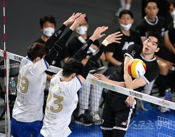 14일 천안유관순체육관에서 열린 ‘2022~2023 도드람 V-리그’ 남자부 현대캐피탈과 우리카드 경기에서 현대캐피탈 허수봉이 우리카드 블로킹 사이로 스파이크를 날리고 있다.