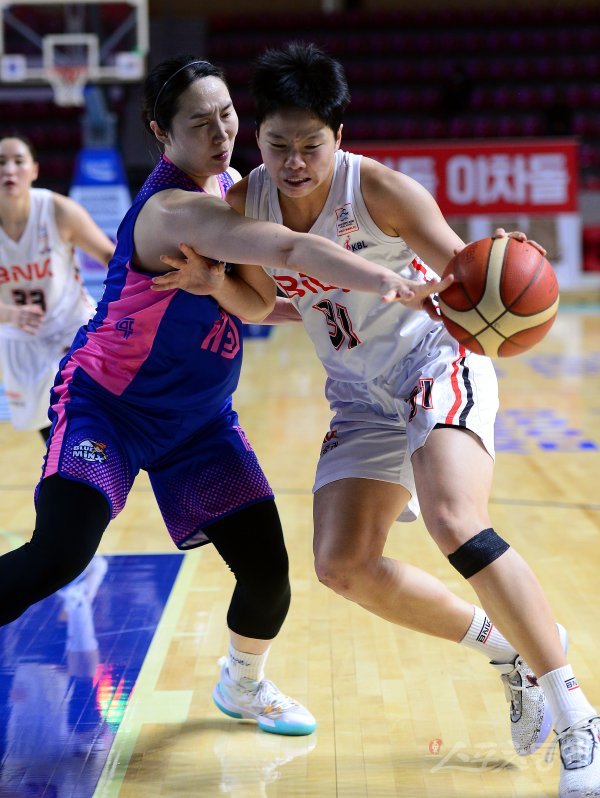 14일 경기도 용인실내체육관에서 열린 ‘신한은행 SOL 2022-2022 여자프로농구’ 용인 삼성생명과 부산 BNK의 경기에서 BNK 진안이 삼성생명 김단비의 수비를 앞에 두고 돌파를 시도하고 있다.