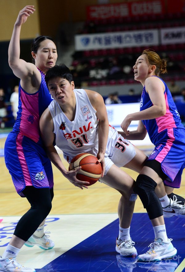 14일 경기도 용인실내체육관에서 열린 ‘신한은행 SOL 2022-2022 여자프로농구’ 용인 삼성생명과 부산 BNK의 경기에서 BNK 진안이 삼성생명 수비에 막혀 넘어지며 슛을 시도하고 있다.