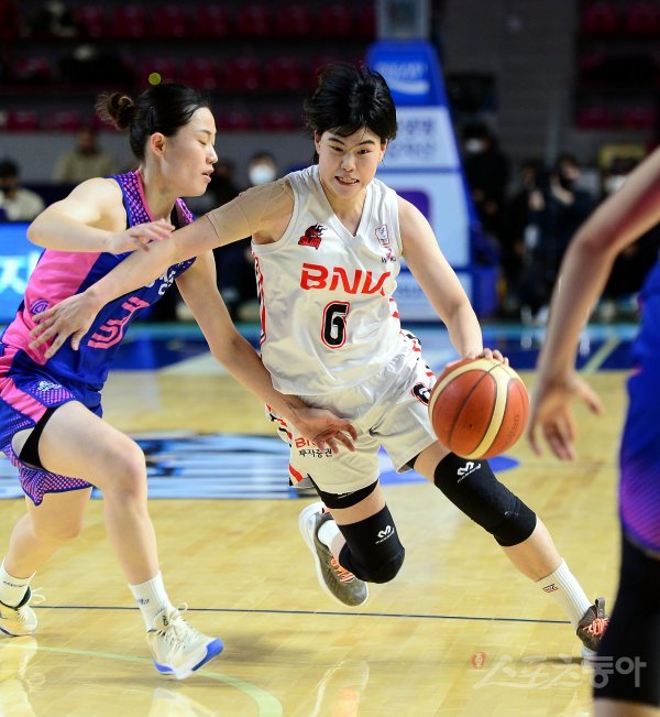 14일 경기도 용인실내체육관에서 열린 ‘신한은행 SOL 2022-2022 여자프로농구’ 용인 삼성생명과 부산 BNK의 경기에서 BNK 이소희가 삼성생명 조수아의 수비를 제치며 돌파하고 있다.