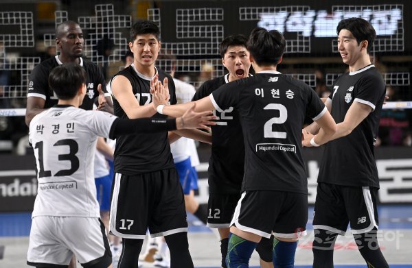 14일 천안유관순체육관에서 열린 ‘2022~2023 도드람 V-리그’ 남자부 현대캐피탈과 우리카드 경기에서 현대캐피탈 전광인이 득점에 성공한 후 허수봉과 기뻐하고 있다.