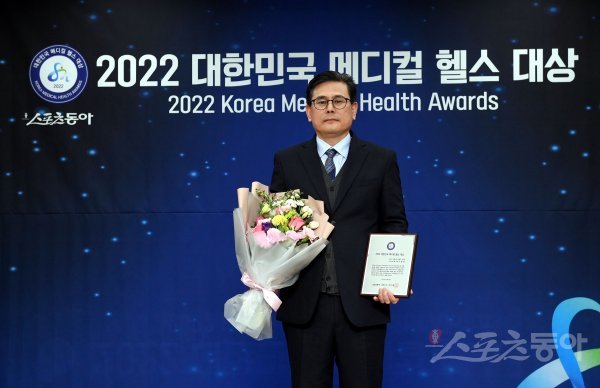 ‘2022 대한민국 메디컬 헬스 대상’ 시상식이 15일 서울 종로 동아미디어센터에서 열렸다. 건강 식음료 브랜드 무문 대상을 수상한 CS1879그룹 김성만 부사장이 기념촬영을 하고 있다.