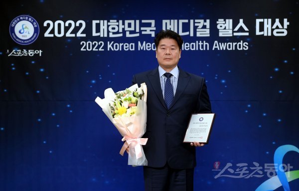 ‘2022 대한민국 메디컬 헬스 대상’ 시상식이 15일 서울 종로 동아미디어센터에서 열렸다. 의료 보건관리 브랜드 부문 대상을 수상한 태가비엠(주) 이종혁 대표가 기념촬영을 하고 있다.
