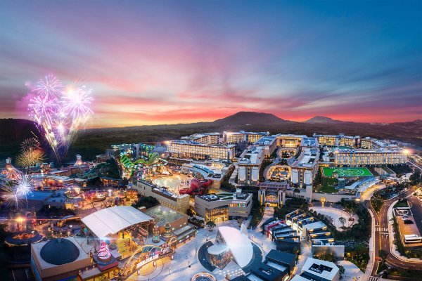 화려한 조명이 연말 호캉스 분위기를 한껏 자아내는 제주신화월드의 야간 전경. 크리스마스와 연말 연시를 맞아 각종 공연과 불꽃놀이, 카운트다운 파티 등이 잇따라 열린다. 사진제공|제주신화월드