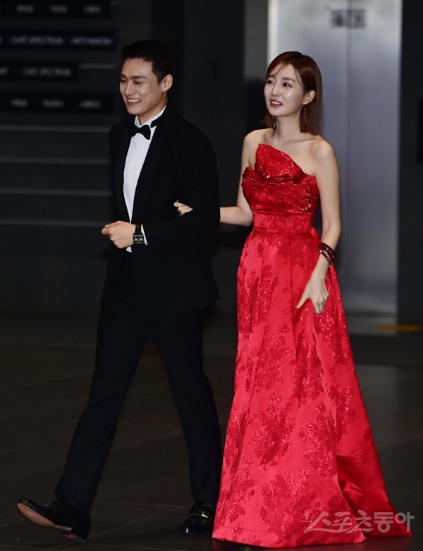 오상진, 김소영 부부가 17일 서울 마포구 상암동 SBS프리즘타워에서 열린 ‘2022 SBS 연예대상’ 포토월 무대에 오르고 있다.
