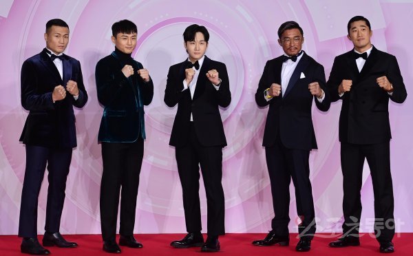 정찬성, 최두호, 이용진, 추성훈, 김동현이 17일 서울 마포구 상암동 SBS프리즘타워에서 열린 ‘2022 SBS 연예대상’ 포토월에서 포즈를 취하고 있다.