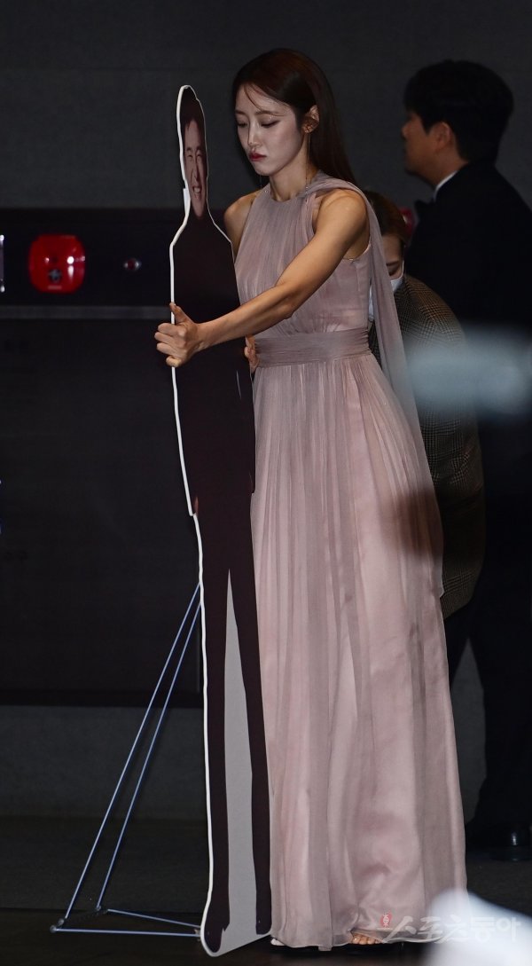 방송인 서하얀이 17일 서울 마포구 상암동 SBS프리즘타워에서 열린 ‘2022 SBS 연예대상’ 포토월 무대에 오르고 있다.