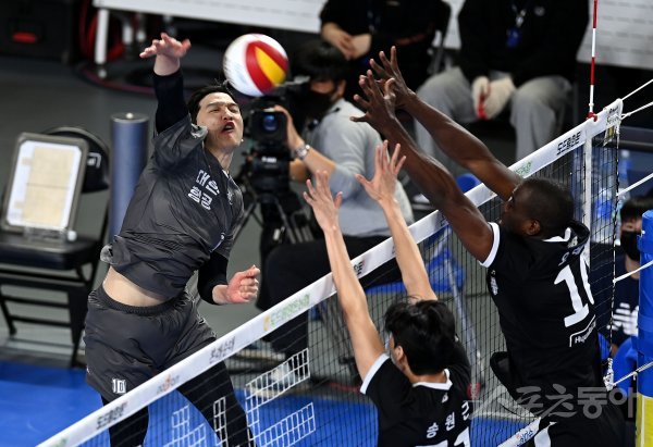 18일 충청남도 천안유관순체육관에서 ‘2022-2023 도드람 V리그’ 천안 현대캐피탈과 인천 대한항공의 남자부 경기가 열렸다. 대한항공 정지석이 현대캐피탈 블로커를 피해 스파이크를 날리고 있다.