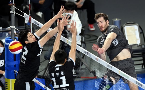 18일 충청남도 천안유관순체육관에서 ‘2022-2023 도드람 V리그’ 천안 현대캐피탈과 인천 대한항공의 남자부 경기가 열렸다. 대한항공 링컨이 현대캐피탈 블로커를 피해 스파이크를 날리고 있다.