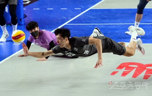 18일 충청남도 천안유관순체육관에서 ‘2022-2023 도드람 V리그’ 천안 현대캐피탈과 인천 대한항공의 남자부 경기가 열렸다. 대한항공 곽승석이 몸을 날려 수비를 펼치고 있다.