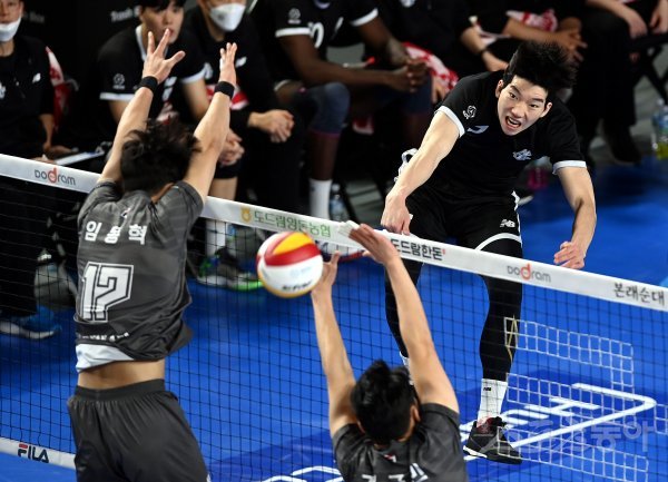 18일 충청남도 천안유관순체육관에서 ‘2022-2023 도드람 V리그’ 천안 현대캐피탈과 인천 대한항공의 남자부 경기가 열렸다. 현대캐피탈 허수봉이 대한항공 블로커를 피해 스파이크를 날리고 있다.