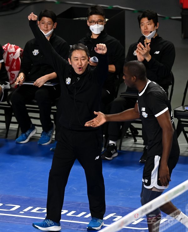 18일 충청남도 천안유관순체육관에서 ‘2022-2023 도드람 V리그’ 천안 현대캐피탈과 인천 대한항공의 남자부 경기가 열렸다. 현대캐피탈 최태웅 감독이 오레올의 득점에 환호하고 있다.