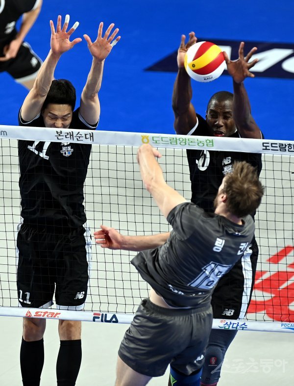 18일 충청남도 천안유관순체육관에서 ‘2022-2023 도드람 V리그’ 천안 현대캐피탈과 인천 대한항공의 남자부 경기가 열렸다. 현대캐피탈 최민호, 오레올이 대한항공 공격을 수비하고 있다.
