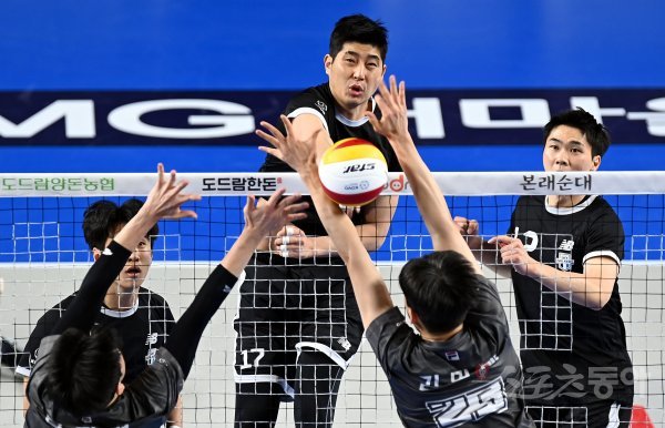 18일 충청남도 천안유관순체육관에서 ‘2022-2023 도드람 V리그’ 천안 현대캐피탈과 인천 대한항공의 남자부 경기가 열렸다. 현대캐피탈 박상하가 대한항공 블로킹을 피해 공격을 펼치고 있다.