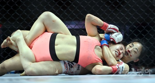 18일 서울 서대문구 스위스 그랜드 호텔 서울에서 ‘굽네 ROAD FC 062’ 가 열렸다. 50kg 계약체중 김유정(오른쪽)과 박서영이 경기를 펼치고 있다.