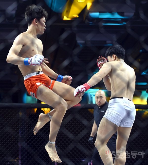18일 서울 서대문구 스위스 그랜드 호텔 서울에서 ‘굽네 ROAD FC 062’ 가 열렸다. 플라이급 정재복과 손재민(왼쪽)이 경기를 펼치고 있다.