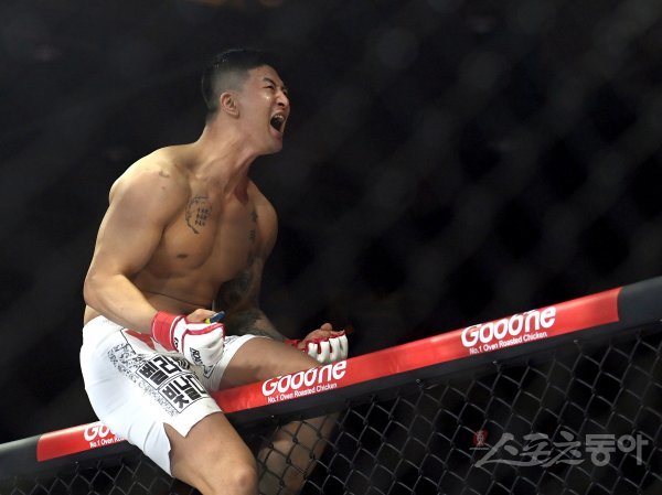 18일 서울 서대문구 스위스 그랜드 호텔 서울에서 ‘굽네 ROAD FC 062’ 가 열렸다. 라이트 헤비급 타이틀전에서 승리한 김태인이 포효하고 있다.