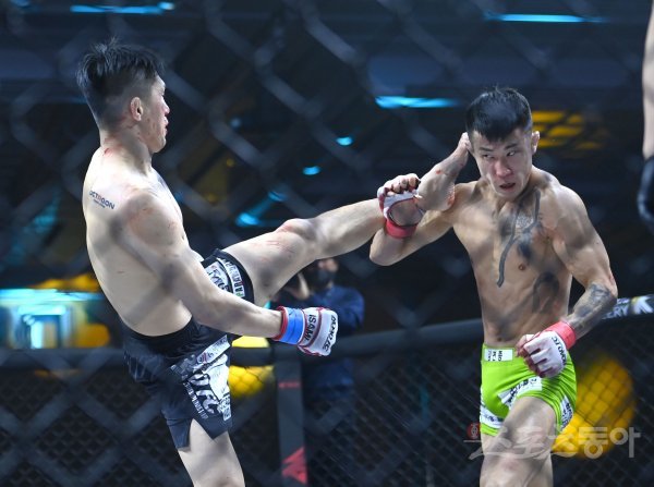 18일 서울 서대문구 스위스 그랜드 호텔 서울에서 ‘굽네 ROAD FC 062’ 가 열렸다. 밴텀급 타이틀전에서 장익환(오른쪽)과 문제훈이 경기를 펼치고 있다.